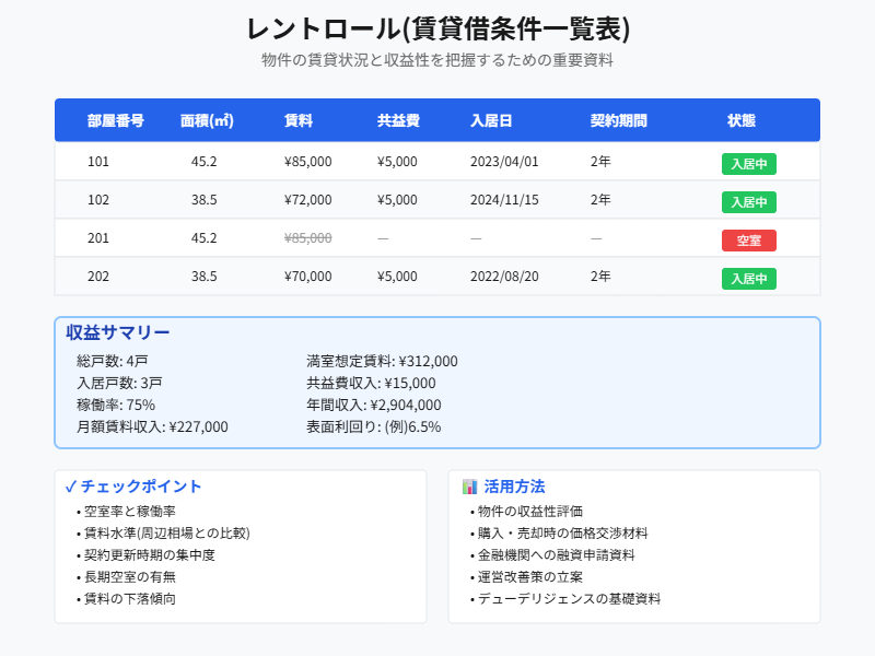それでは、レントロールには具体的にどんなことが書かれているのか、中身を詳しく見ていきましょう。 決まった書式はないのですが、一般的には以下のような情報が載っています。