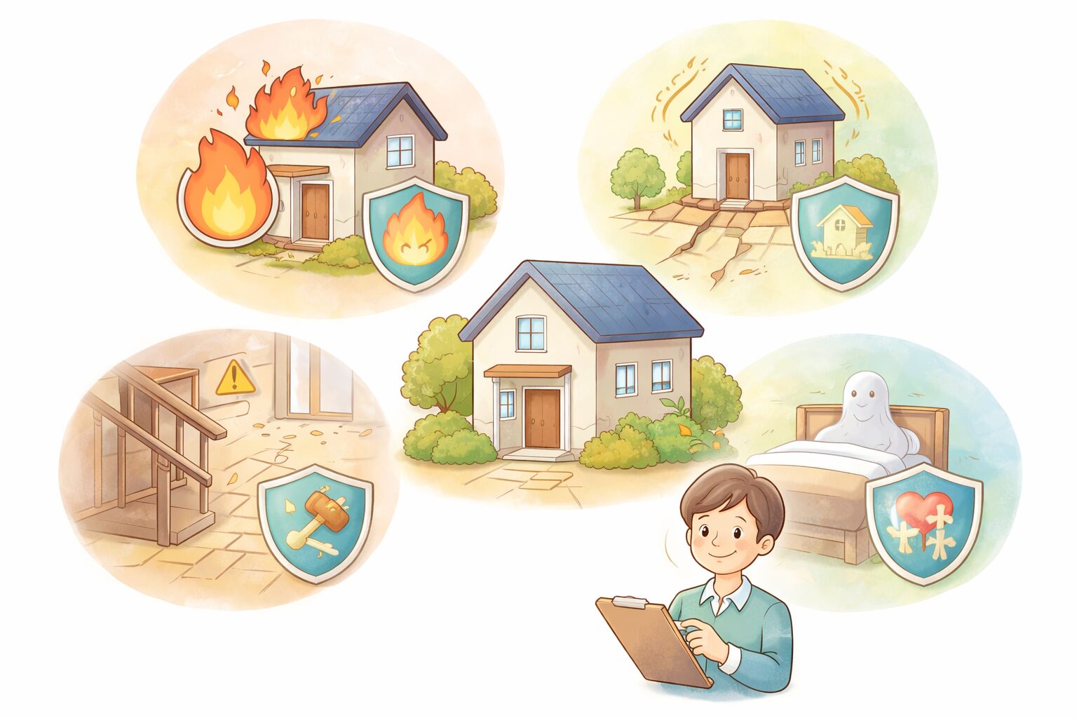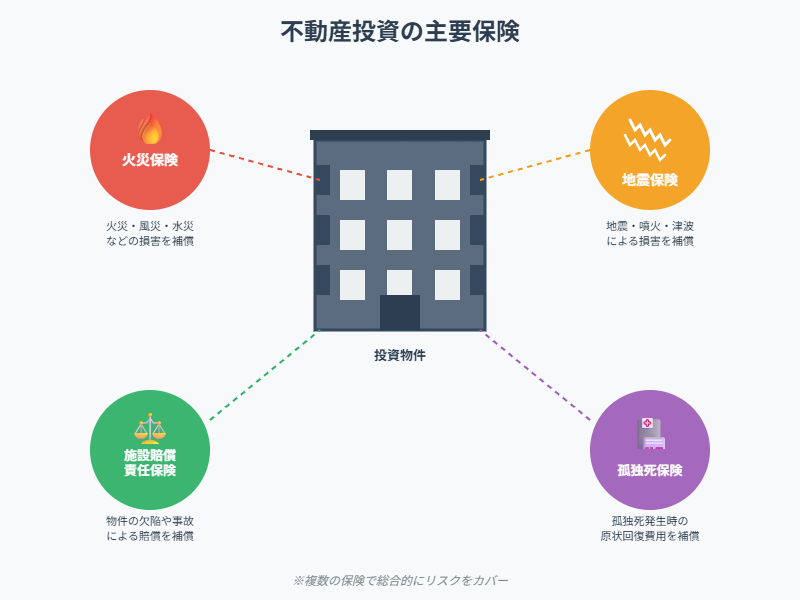 不動産投資における主要な保険は、火災保険とか地震保険とか、大家さんが物件を運営する上で起こりうるトラブルに備える仕組みのこと。